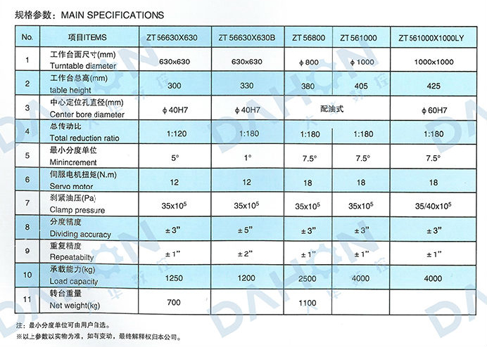 ZT 56 series NC indexing rotary table can be used on NC milling machine and machine center for carrying out equaldivision.It is driven by servo motor and mechanical rotary table with non-lifting Hirth coupling.